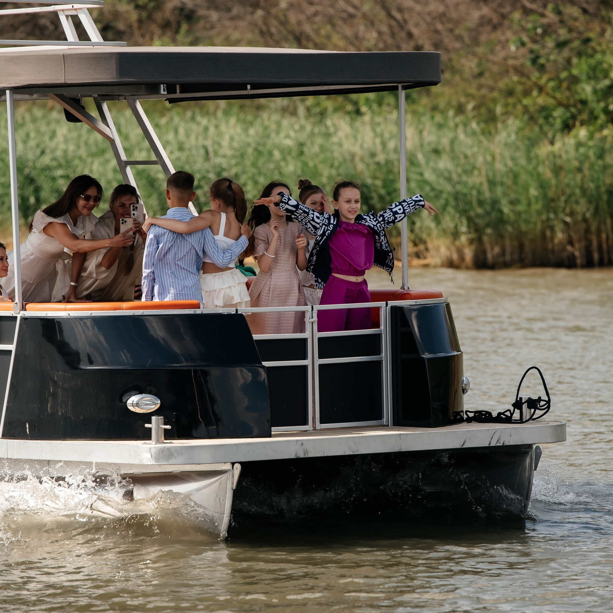 Атмосфера лёгкости и приключений: зелёная лужайка для встреч, фотозона с воздушными композициями, будто зовущими в путешествие. Прогулка на теплоходе стала настоящим мини круизом: дети любовались видами, делились мечтами и чувствовали себя настоящими путешественниками.