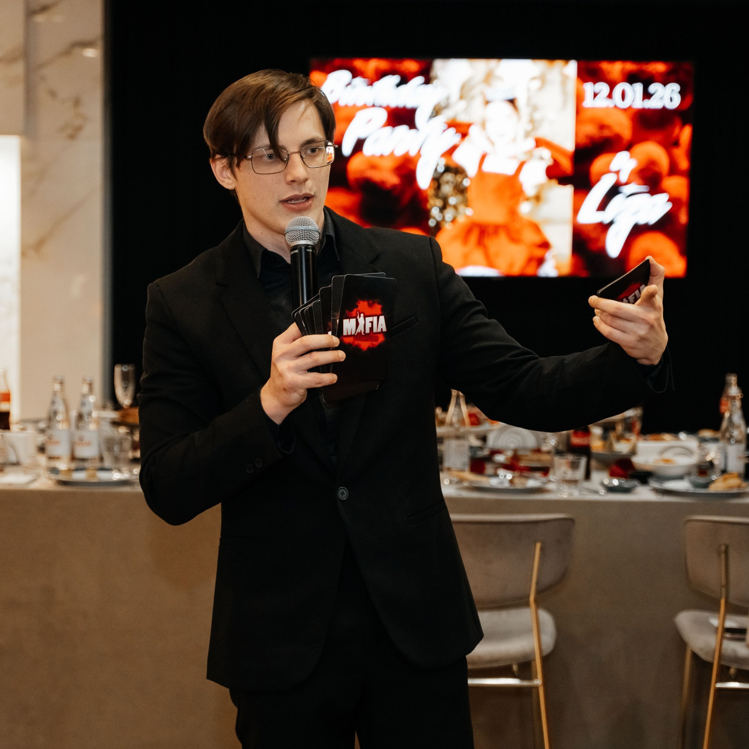 Караоке челленджи задали тон вечеру: гости пели громко, смеялись искренне и заряжались энергией. Особенным моментом стала заранее записанная песня от именинницы — сюрприз, который тронул всех до глубины души и вызвал бурю аплодисментов.