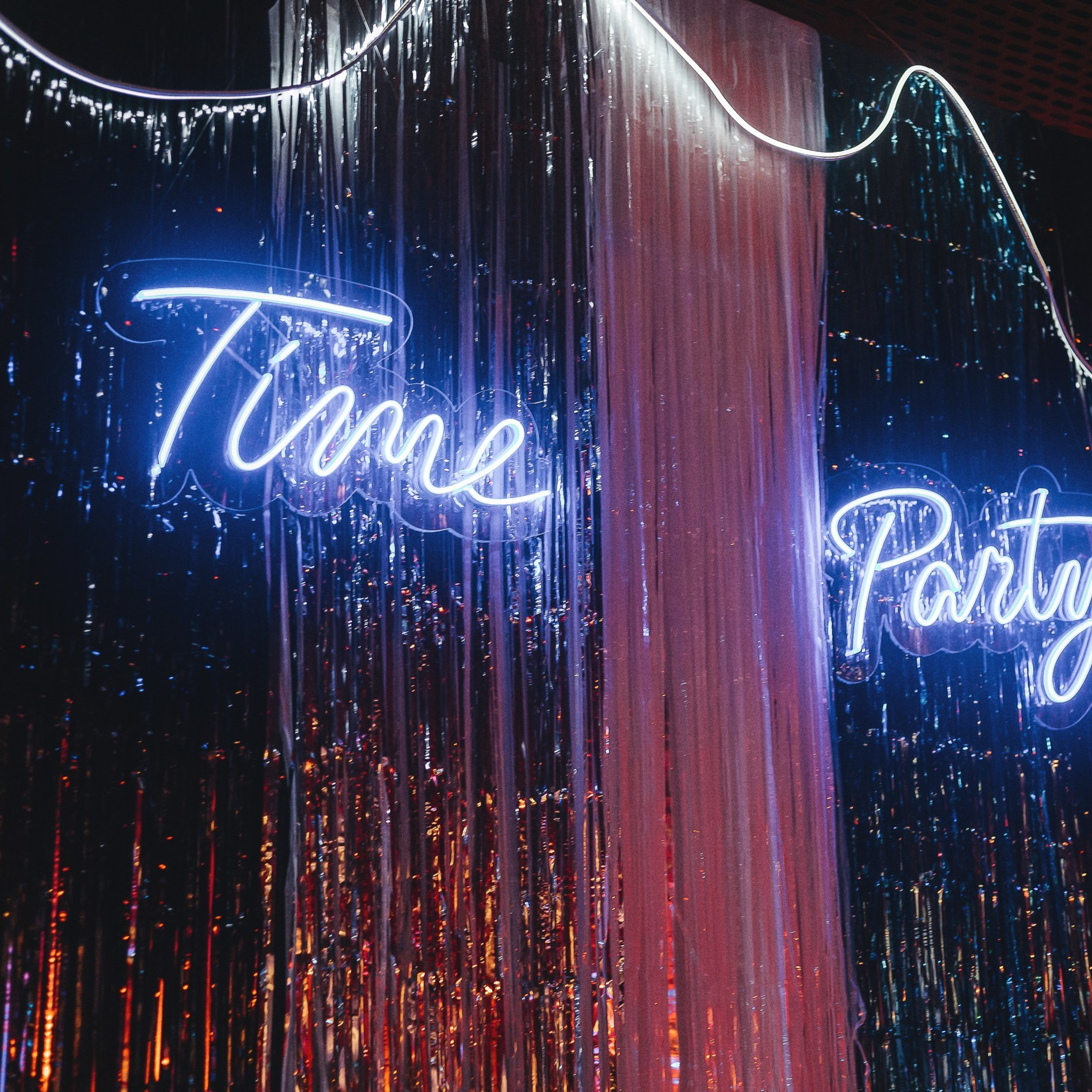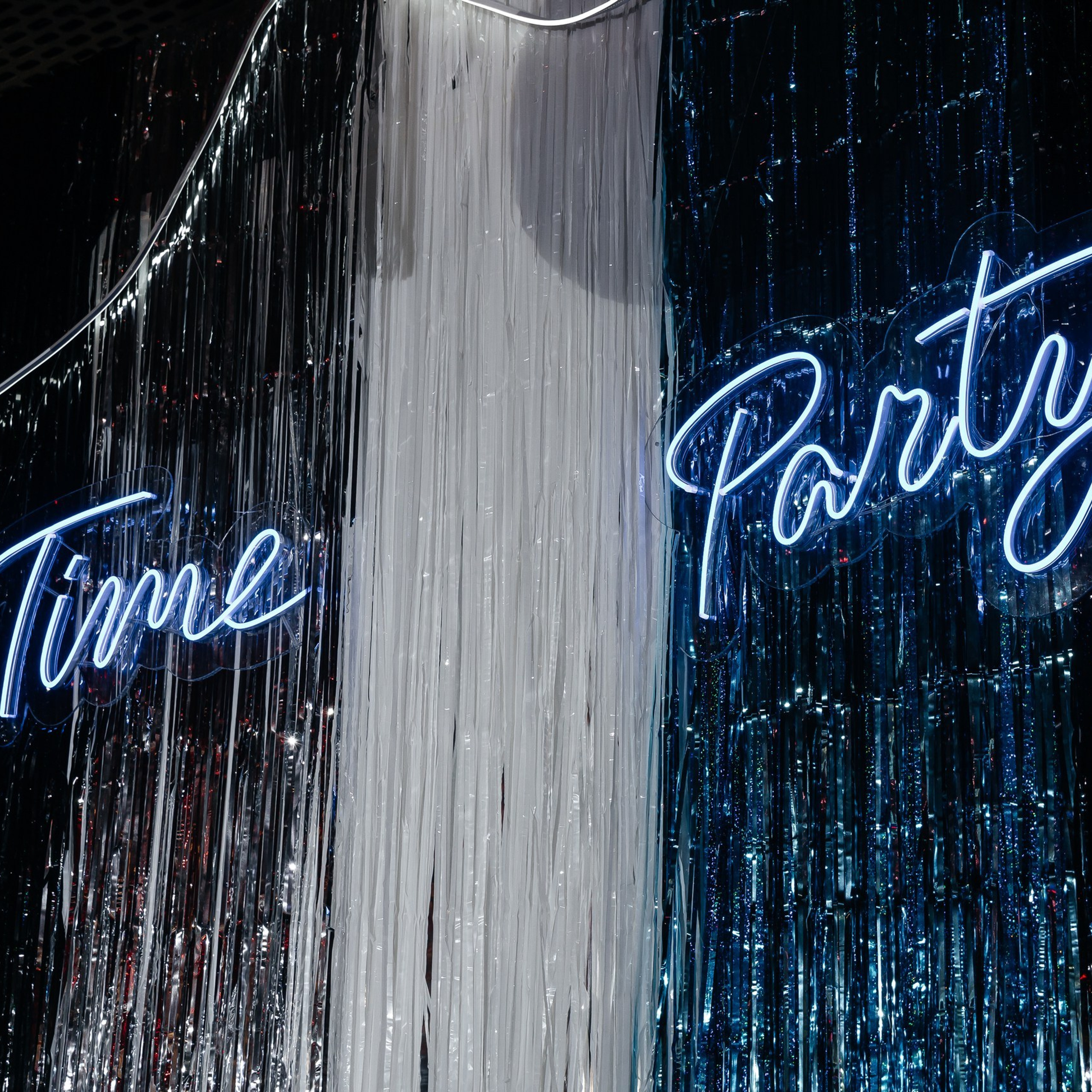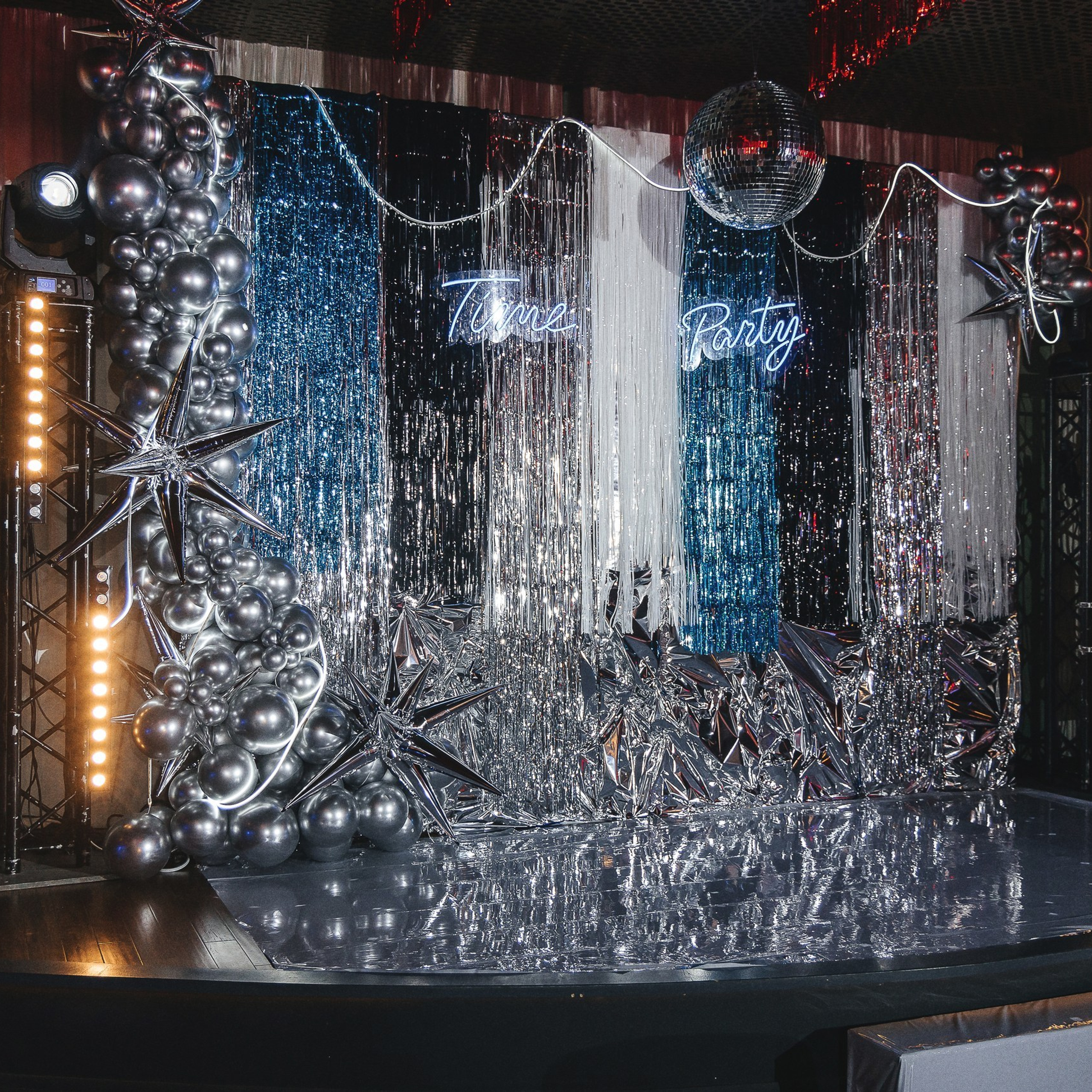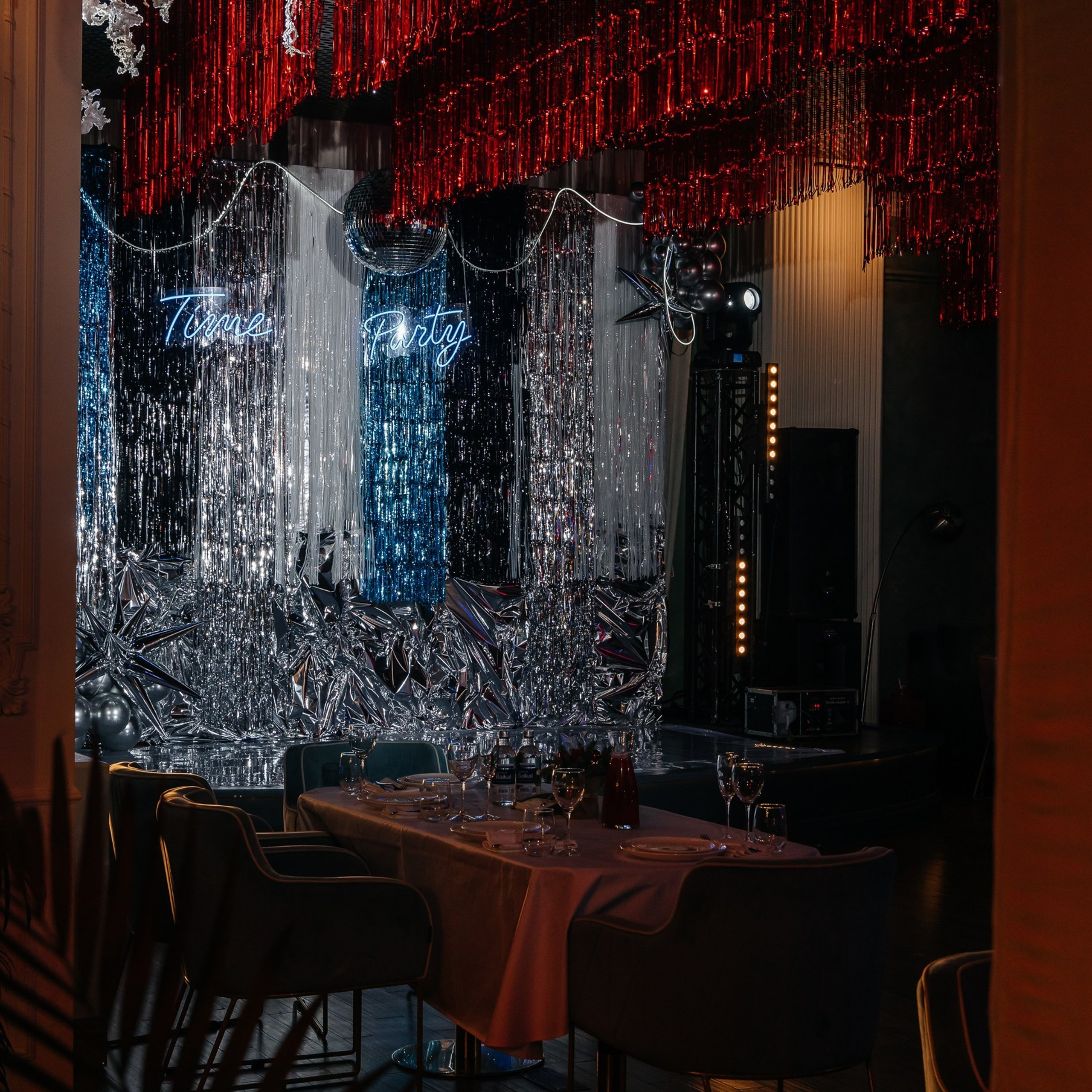 С первых минут гостей встречала стильная фотозона: неоновая надпись Time Party, диско-шар и серебристые акценты — идеальный фон для кадров, которые потом разлетелись по чатам.